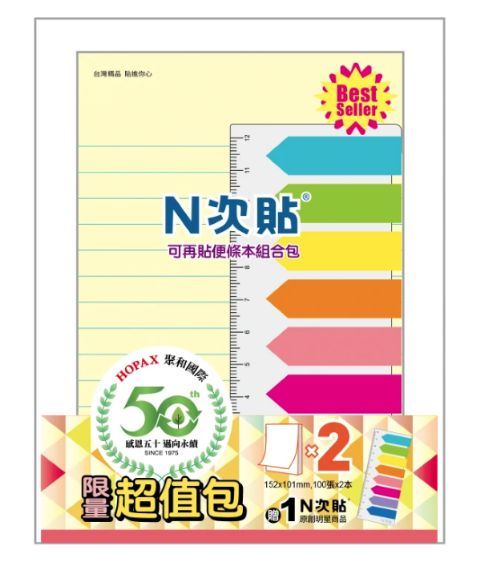 N次貼 67028 可再貼便條標籤組合 156x101mm橫線便條本+8色螢光標籤