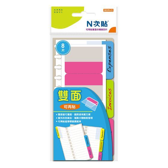 ◎特 色:雙面皆可書寫,翻頁使用更方便• 螢光四色組合,檔案分類輕鬆管理• 可再貼超厚標籤更耐用