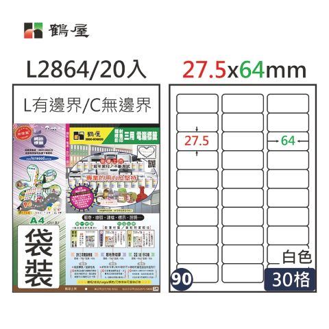 鶴屋 #090 L2864 白 30格 20入 三用標籤/27.5×64mm