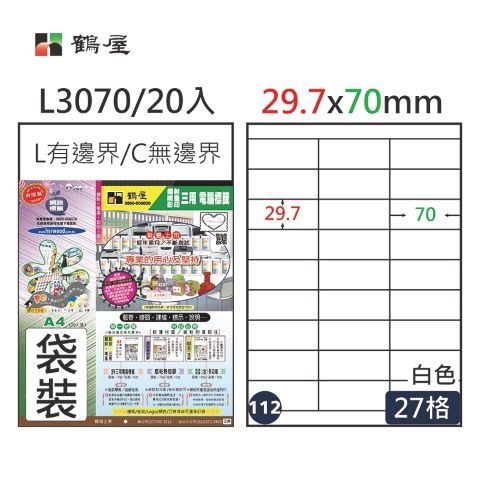 鶴屋 #112 L3070 白 27格 20入 三用標籤/29.7×70mm