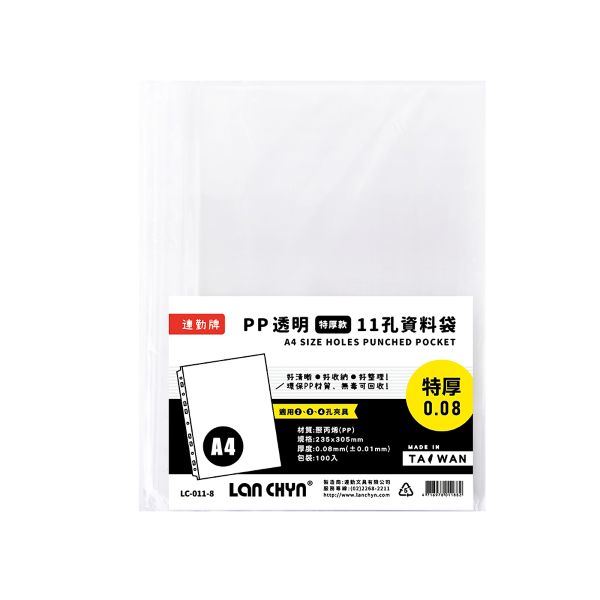 【聯全文具行】連勤 LC-011-8 PP 11孔 A4 內頁資料袋 特厚0.08mm 100入