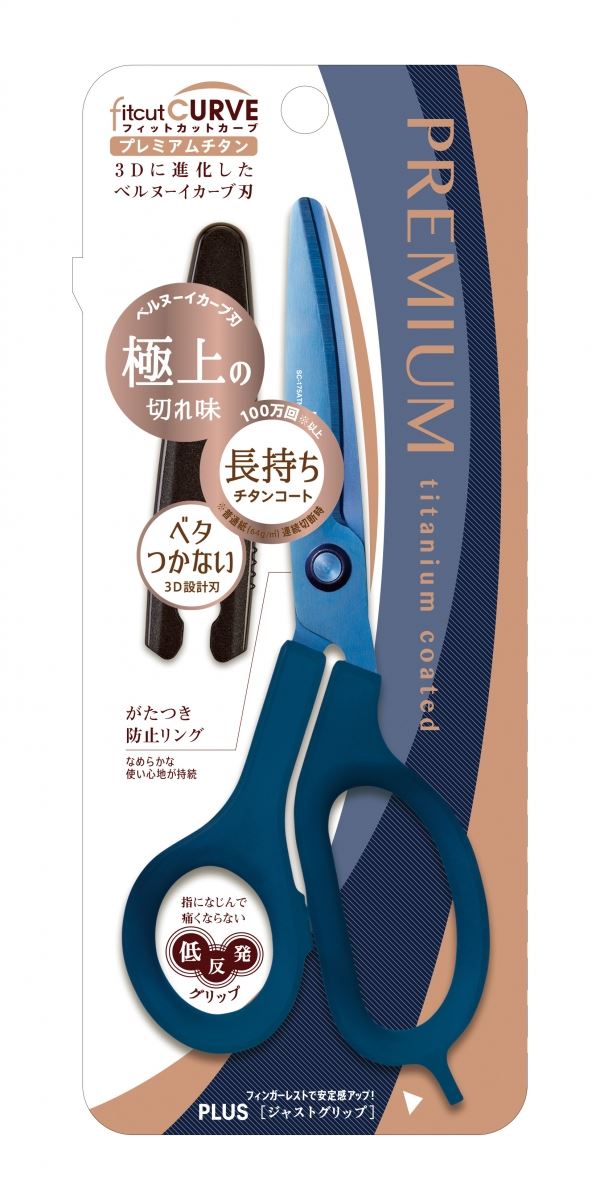PLUS SC-175ATN 30度弧線剪刀(鈦金屬+3D凹面不沾膠+不對稱) 深藍