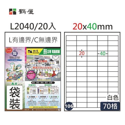 鶴屋 #106 L2040 白 70格 20入 三用標籤/20×40mm